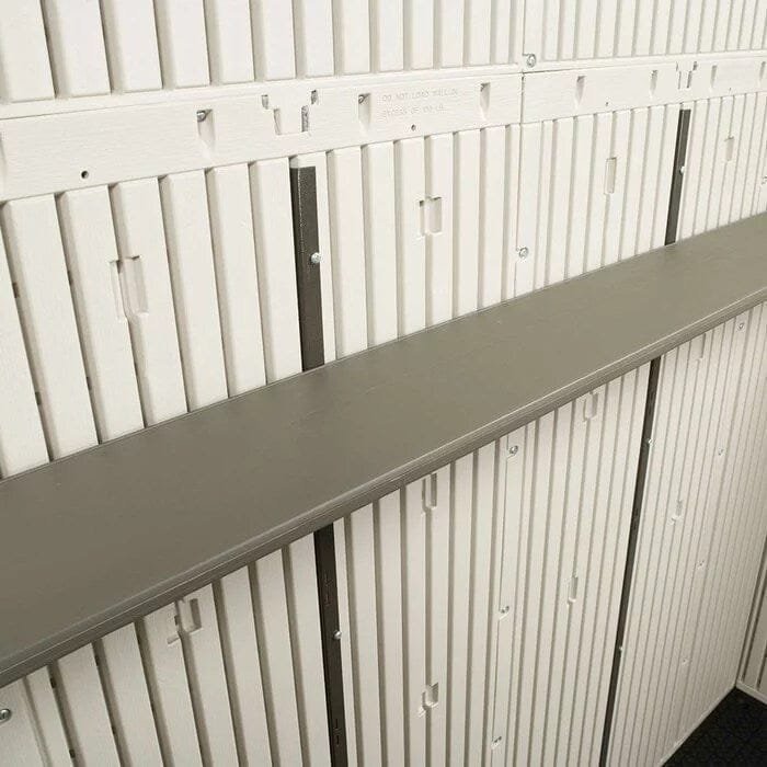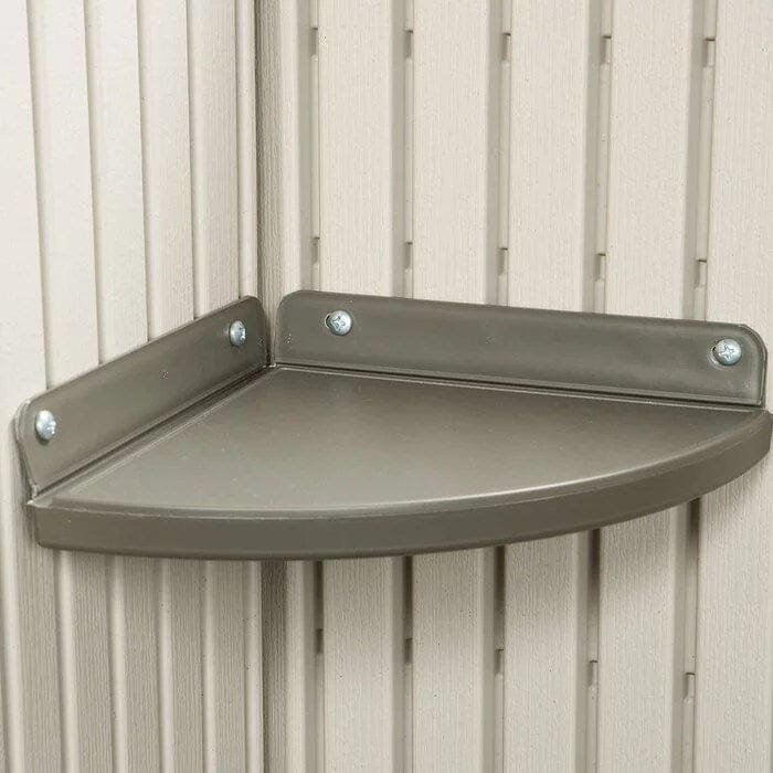 Shed TypeStorage ShedPrimary MaterialPlastic; MetalMaterial DetailsHigh-density polyethylene and steelPowder Coated FinishYesColorDesert tan and dark brownStorage Capacity491 cubic feetFoundation RequiredYesFoundation IncludedYesFoundation MaterialWoodFloor IncludedYesImpact Resistant FlooringYesFloor MaterialPlastic/PolyethyleneWindows IncludedYesNumber of Windows1Functional WindowsYesWindow Lock IncludedYesBuilt-In Shelving IncludedYesNumber of Shelves5Ventilation IncludedYesShingles IncludedNoSkylight IncludedYesFlower Box IncludedNoNumber of Doors2Door StyleDouble DoorPadlock Compatible DoorsYesYear-Round UseYesWind Rating65Weather ResistantYesFire ResistantYesWater ResistantYesUV ResistantYesRot ResistantYesRust ResistantYesMildew ResistantYesAssembly