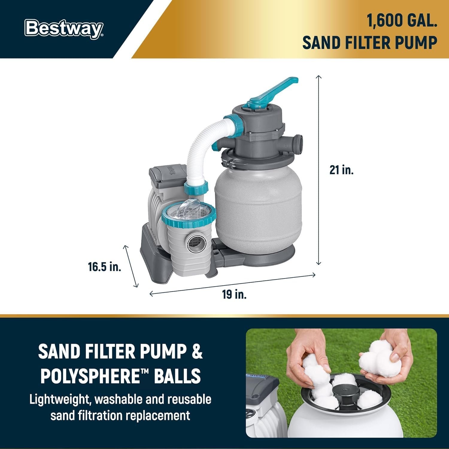 Included Accessories: Includes a 1,600 GPH sand filter pump, 250 grams of Polysphere pool filtration balls (washable, reusable sand filtration replacement), a ladder, pool cover, and a repair patch