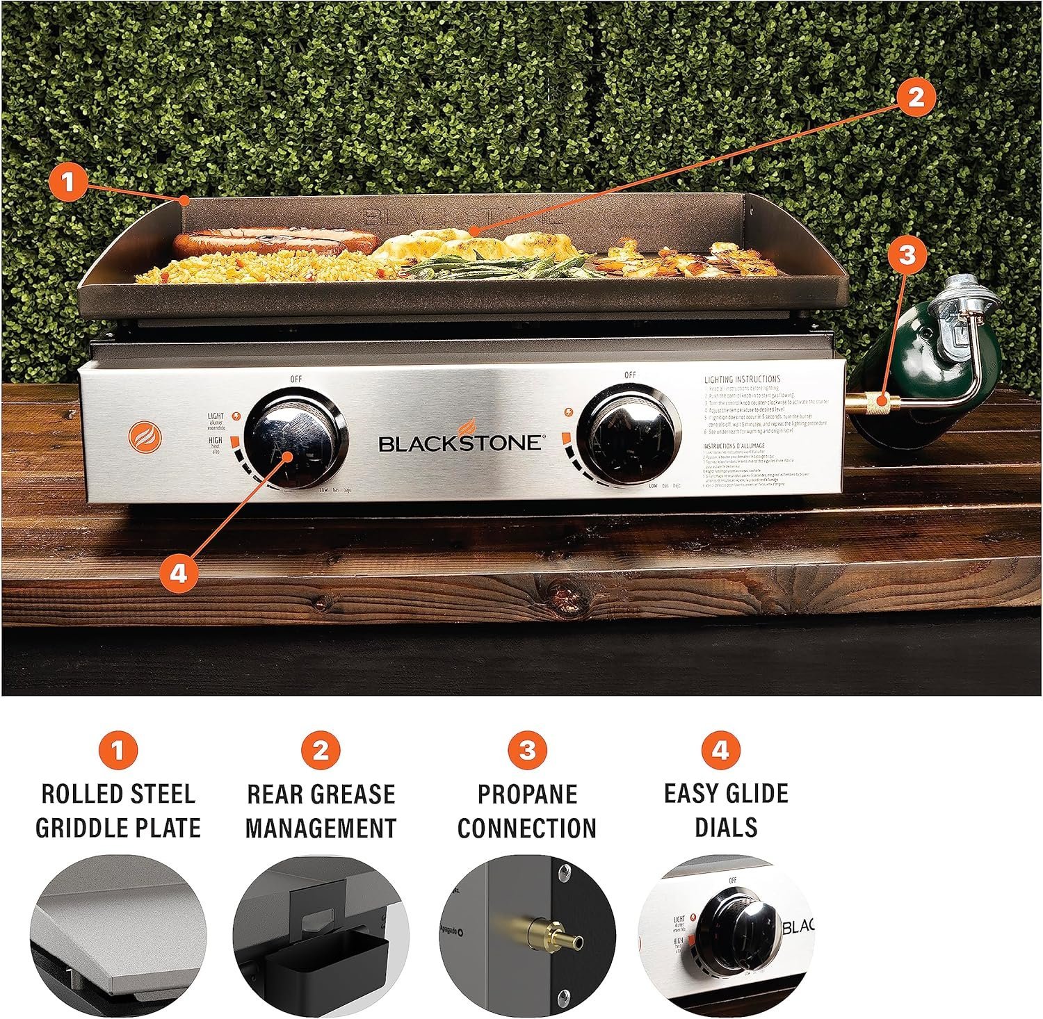 Blackstone 22″ Portable Tabletop Griddle – Dual Burner Flat Top Grill, 24,000 BTU Propane with Stainless Steel Faceplate & Rear Grease System