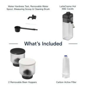 54mm stainless steel portafilter, 480ml stainless steel milk jug, 1 & 2 cup single and dual wall filter baskets, Water filter holder with filter, Water hardness strip, the Razor™ precision trimming tool, Cleaning tablets, Steam wand cleaning tool, Cleaning disc, Cleaning brush, Descale powder