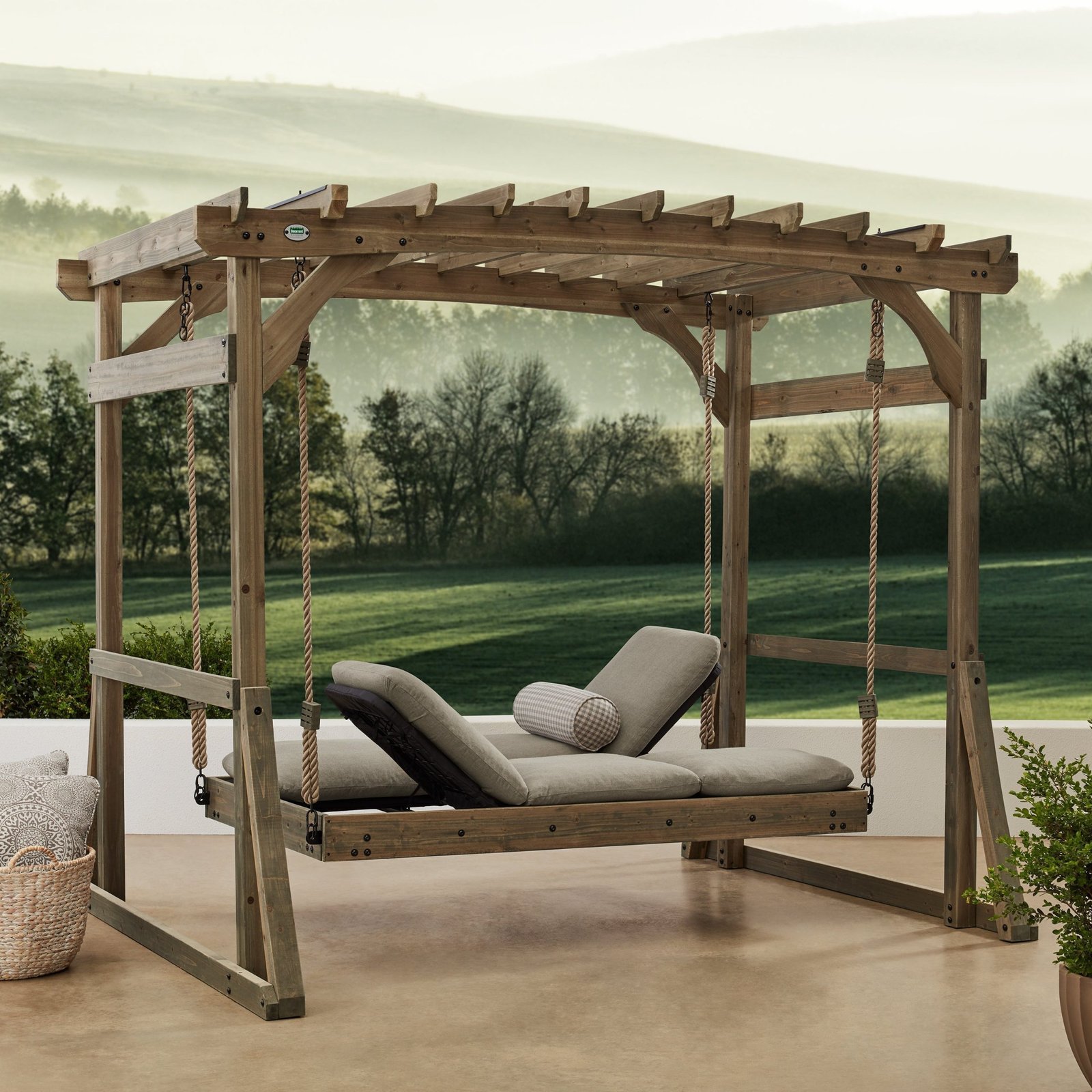 Swing into relaxation with the new Claremont Lounger from Backyard Discovery and take comfort to the next level. Newly designed with more seating options, the multi-position seat converts to a daybed or two, opposite facing chaise lounges. The comfy, overstuffed cushions are covered with Sunbrella® fabric for beauty and durability. The rustic barnwood stain with black hardware accents looks beautiful in any backyard. The graceful, gentle sway makes the Backyard Discovery Claremont Lounger the perfect solution for any backyard enthusiast.