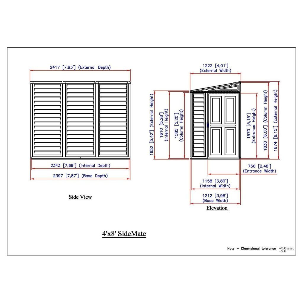 today.The SideMate 4×8 vinyl shed is an easy-to-assemble outdoor storage solution designed to be placed on the side of your home. The contemporary design beautifies any backyard while maximizing storage space for yard tools or garden equipment. Constructed of durable all weather vinyl in a neutral ivory color, the SideMate vinyl shed is maintenance free. It will never need painting or treating. It will not rust, dent, rot, mildew or fade. It is also fire retardant and much quieter in the rain than metal storage sheds. The wall columns are reinforced with a solid metal structure, giving the vinyl shed a lot of strength and making it easy to hang shelves or garden tools inside. The foundation kit provides a galvanized metal foundation. It eases the installation process, ensures a square shed and elevates your floor off the ground. With the foundation kit you’ll be able to build your shed the day you receive it.