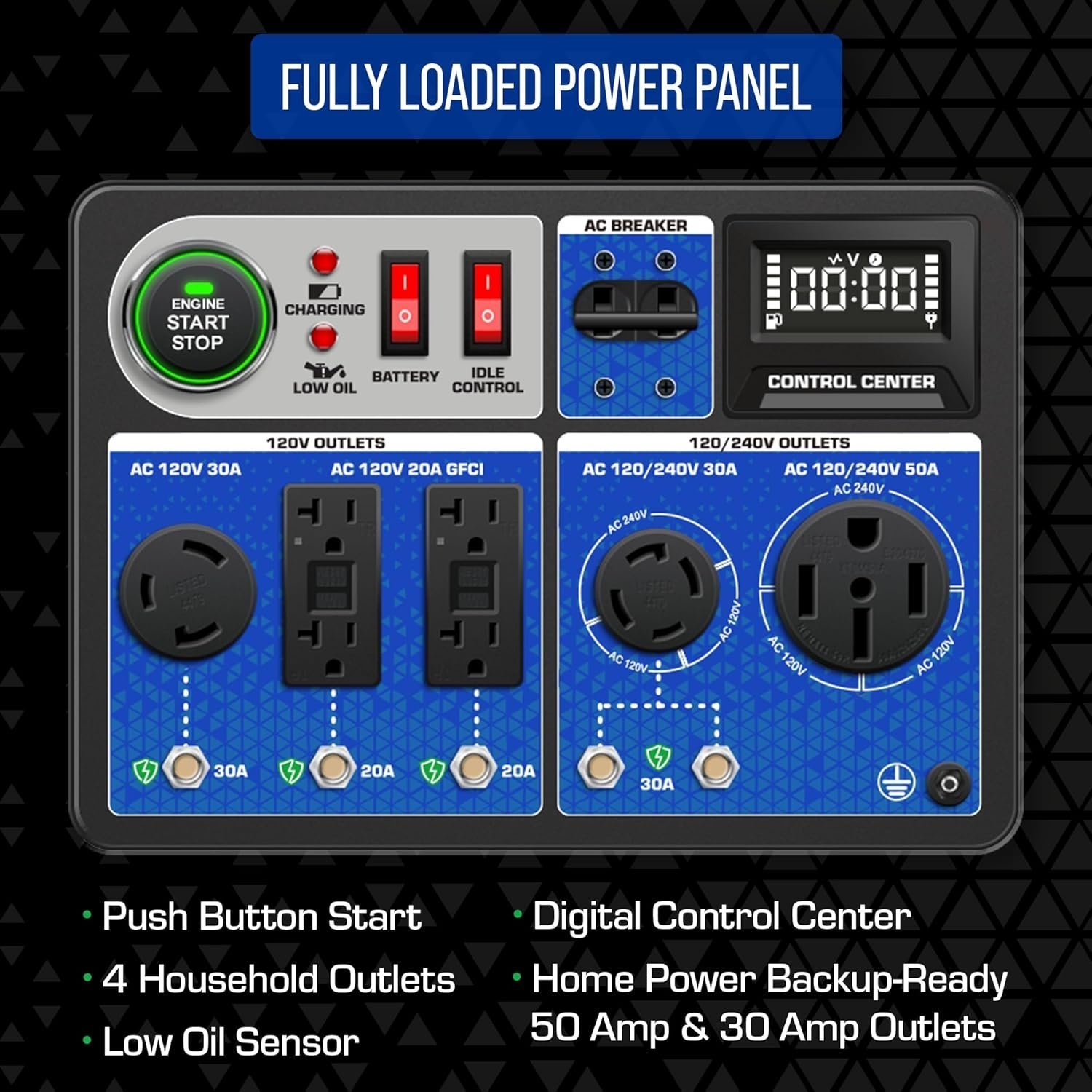 The XP13000HXT comes with a push button start, a front facing interface that allows you to change your fuel type in seconds, and a wide variety of outlets including a transfer switch-ready 50 amp outlet