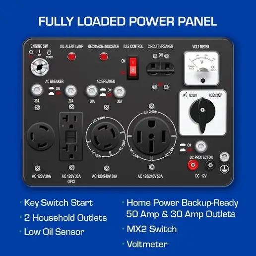 MX2 Technology – Get the maximum power from each of the 120-Volt receptacles. Choose between operating the generator at both 120V and 240V simultaneously, or at 120V only with full power. Ideal for usage with RVs.