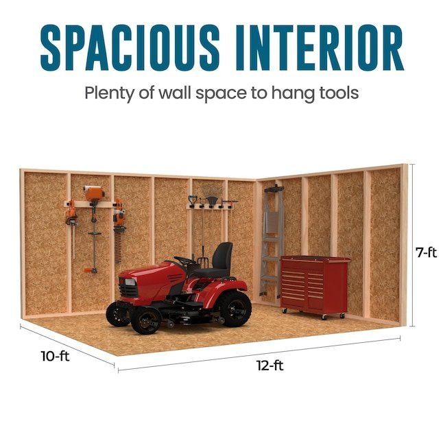 7 ft tall sidewall height provides convenient vertical storage for rakes, shovels, ladders and more