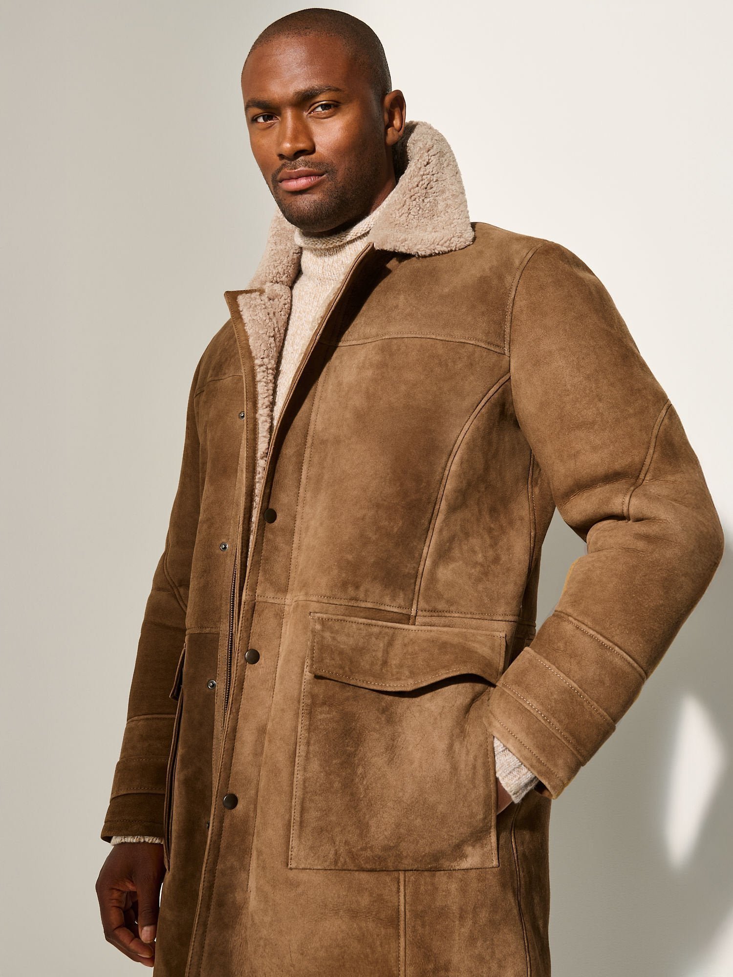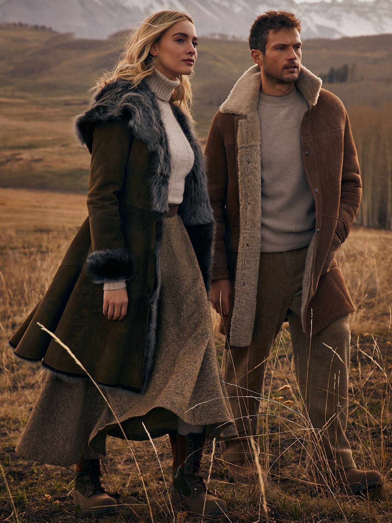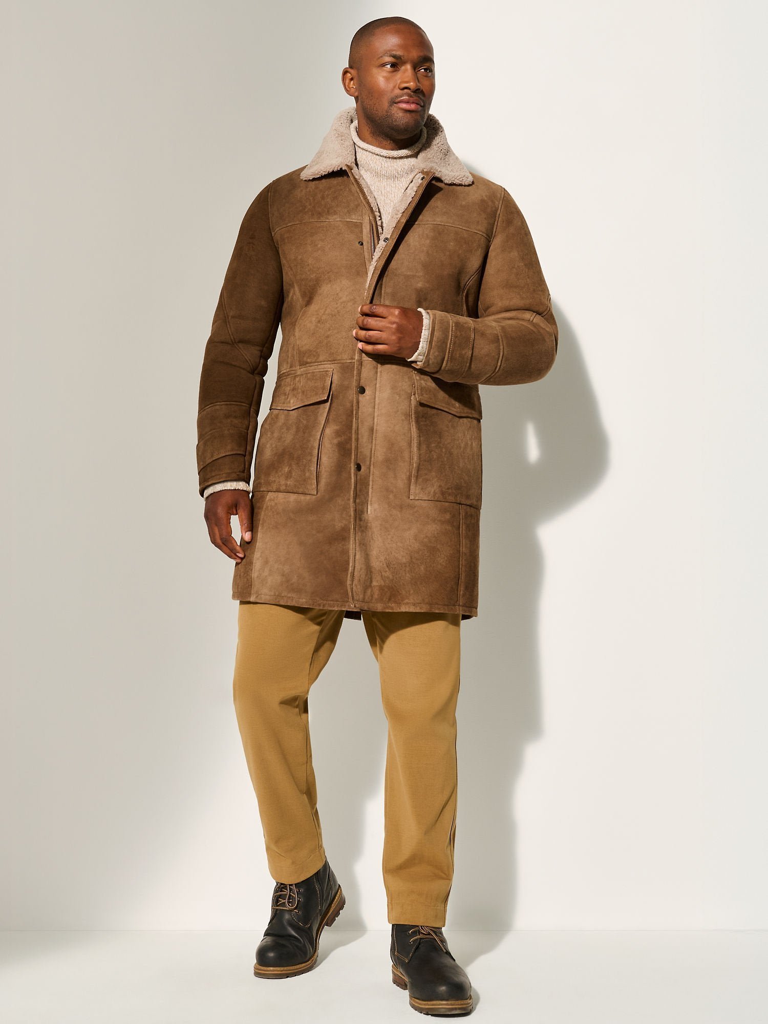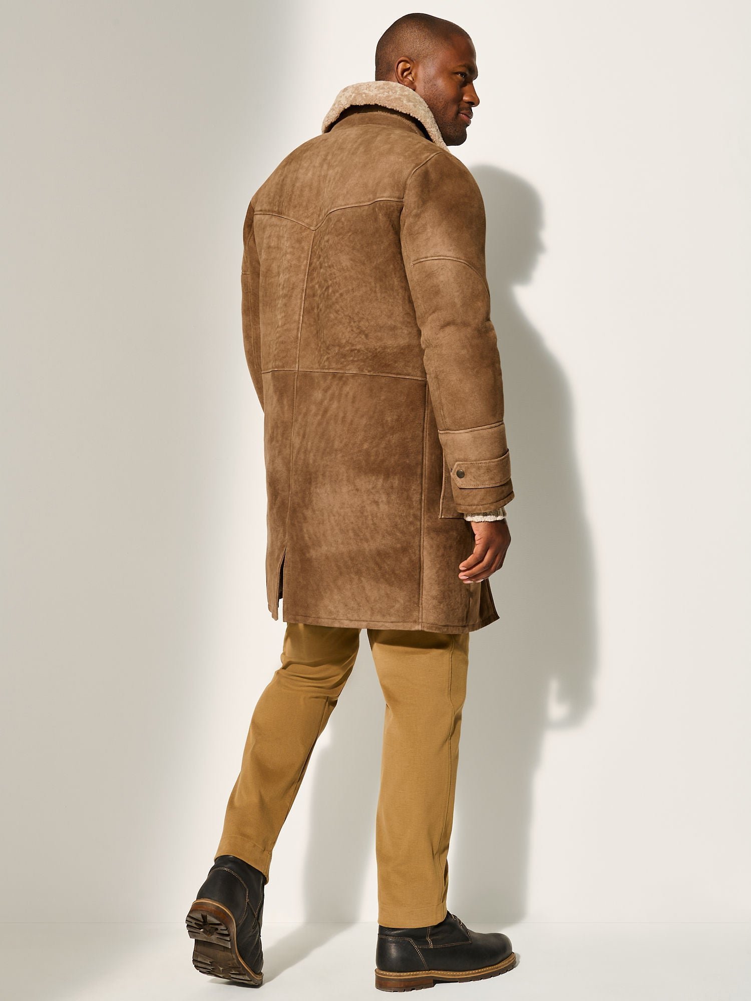 Artisan crafted to shield you from the most freezing temperatures, our High Country shearling sheepskin coat will move comfortably wherever you go. Its smart, snap-and-zip front closure and cuff straps help keep the cold air out, while its generous collar easily pops up around the neck to keep warmth in. Bring High Country along on a brisk mountain walk or while exploring busy city streets.