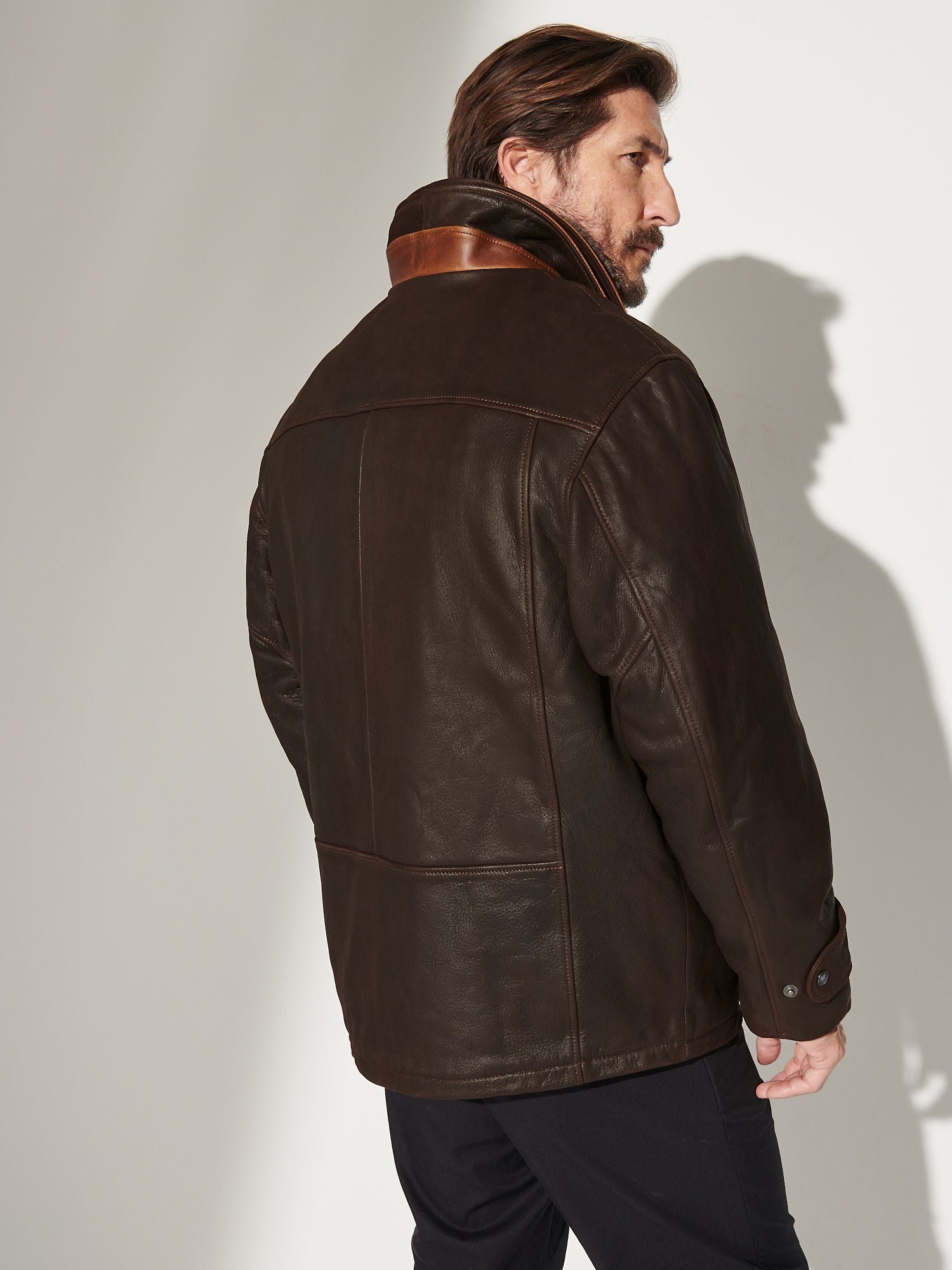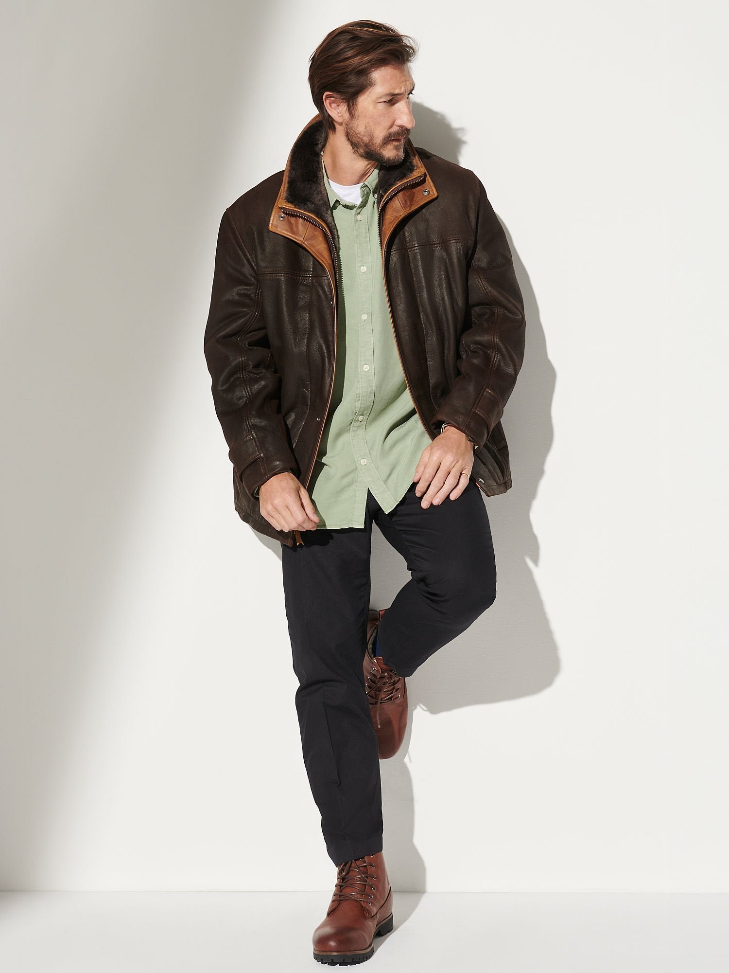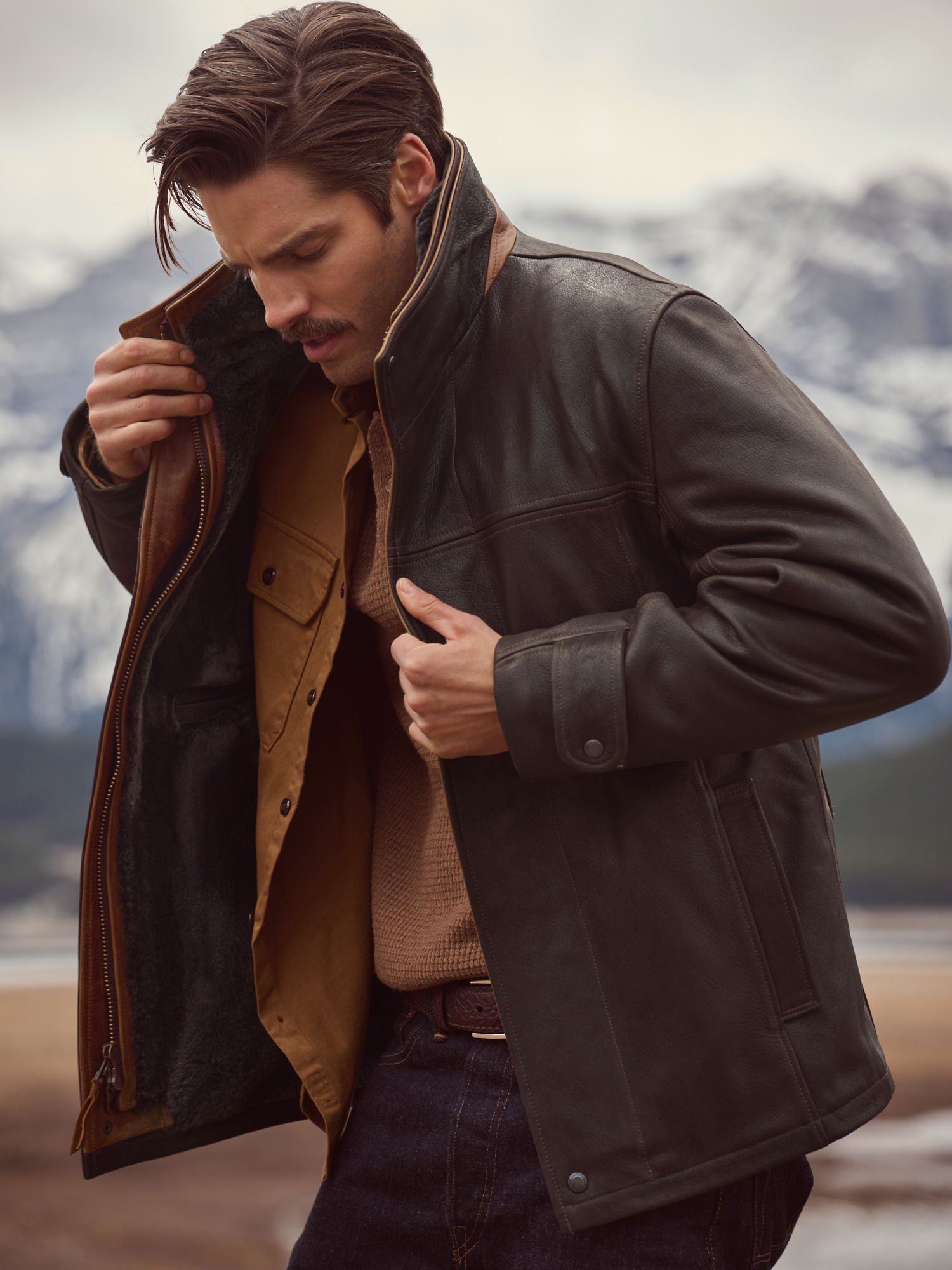 A handsome coat for town or country, our Jack Frost leather coat with shearling lining lives up to its name and keeps you cozy when temperatures plummet. Made of fine French Kildare goatskin known for its toughness and resilience but with an incredible texture, it features a Spanish Merino shearling lining in the body of the coat and a smooth acetate lining in the sleeves for increased mobility. The Jack Frost delivers unmatched warmth and comfort, hour after hour. A relaxed fit makes for easy layering, and a zip front makes for easy on/off. For added weather protection, the Jack Frost features a storm flap with four snap buttons and contrasting Italian calf trim inside. Adjustable snap cuffs, 2 interior pockets, and 2 exterior hand-warming pockets complete this timeless design.