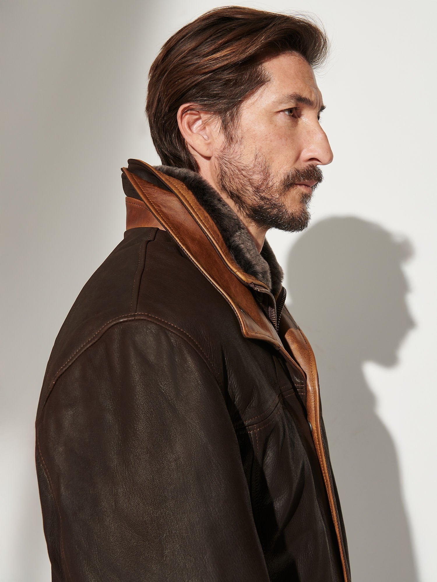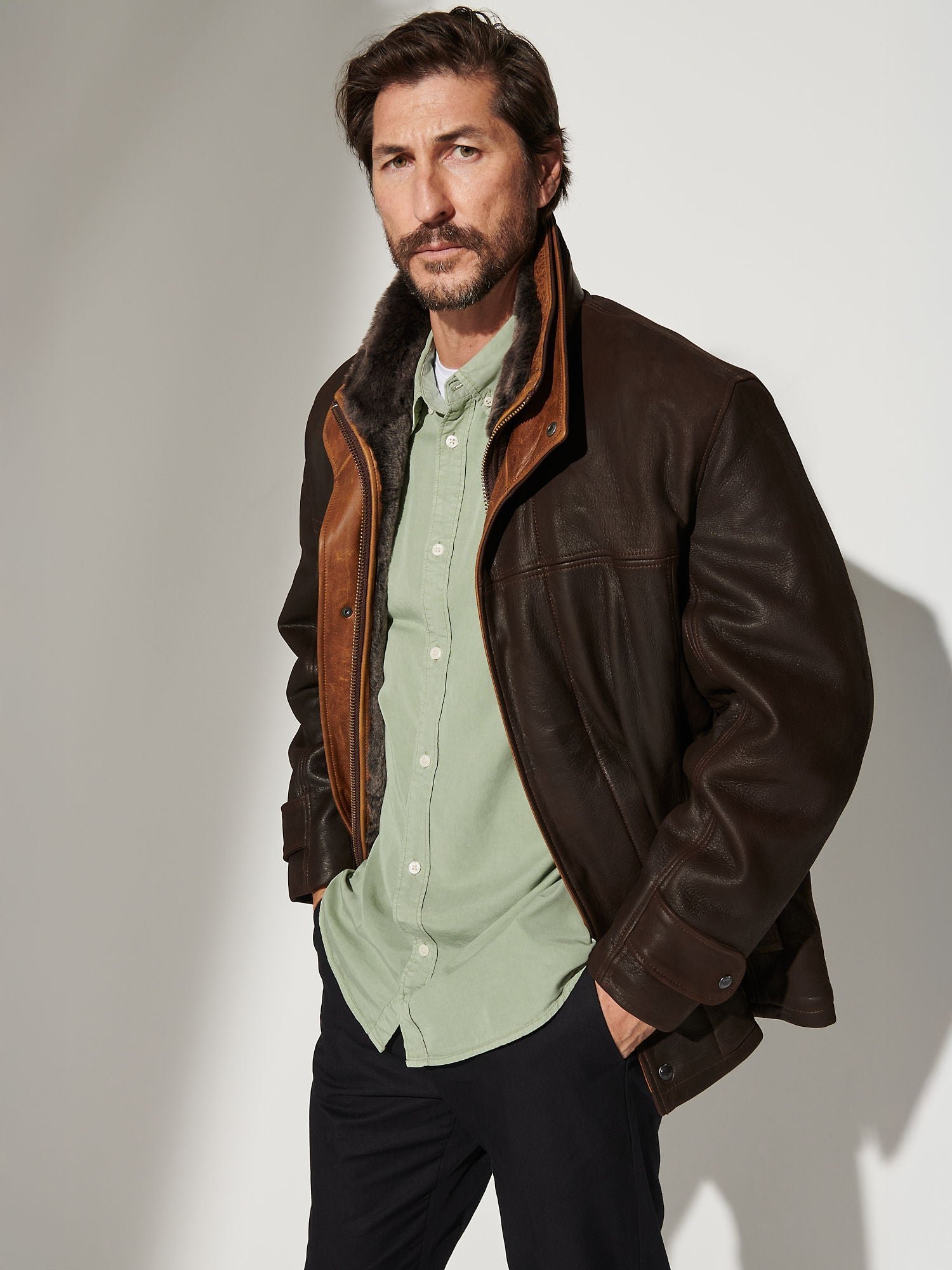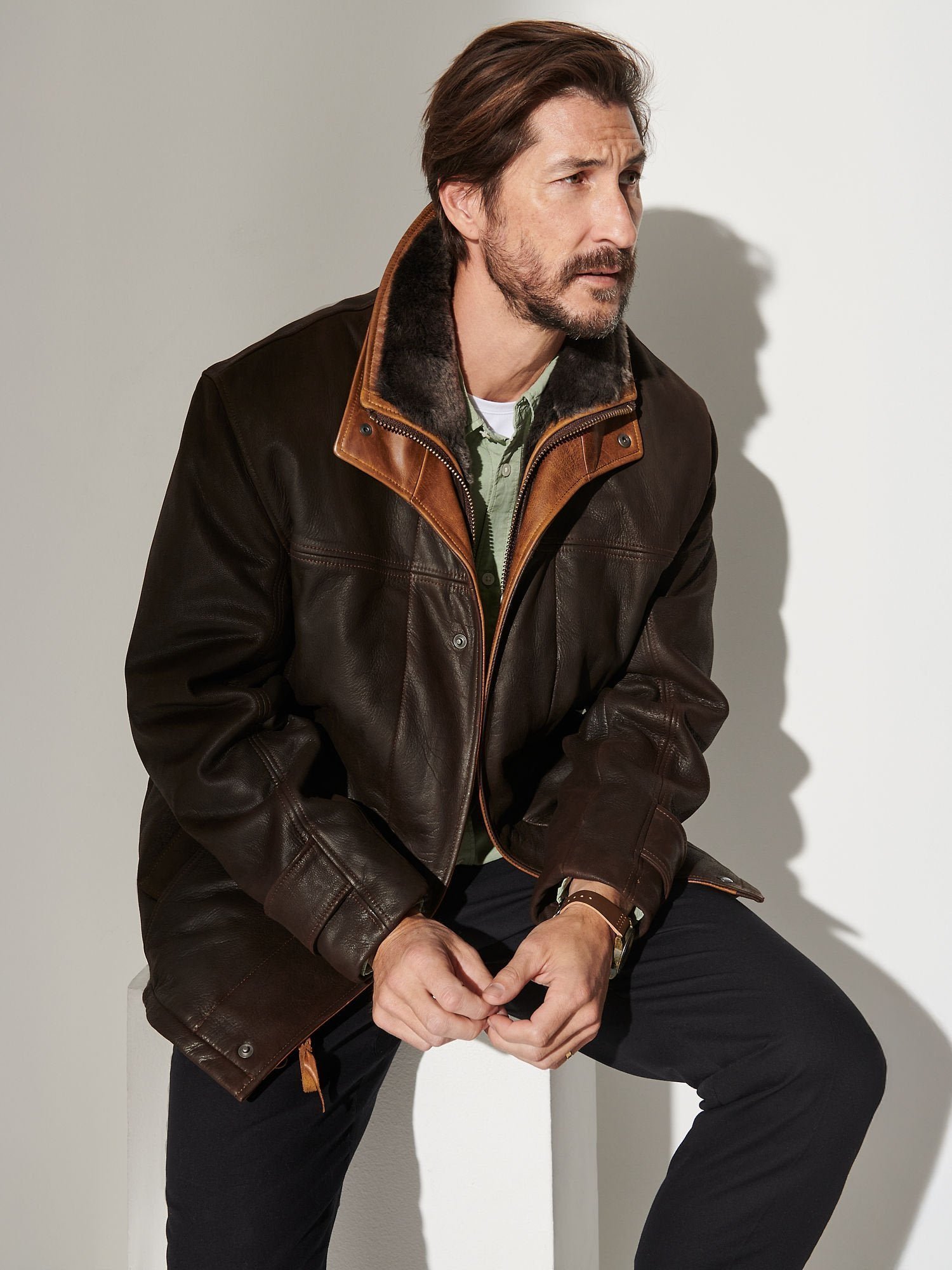 A handsome coat for town or country, our Jack Frost leather coat with shearling lining lives up to its name and keeps you cozy when temperatures plummet. Made of fine French Kildare goatskin known for its toughness and resilience but with an incredible texture, it features a Spanish Merino shearling lining in the body of the coat and a smooth acetate lining in the sleeves for increased mobility. The Jack Frost delivers unmatched warmth and comfort, hour after hour. A relaxed fit makes for easy layering, and a zip front makes for easy on/off. For added weather protection, the Jack Frost features a storm flap with four snap buttons and contrasting Italian calf trim inside. Adjustable snap cuffs, 2 interior pockets, and 2 exterior hand-warming pockets complete this timeless design.