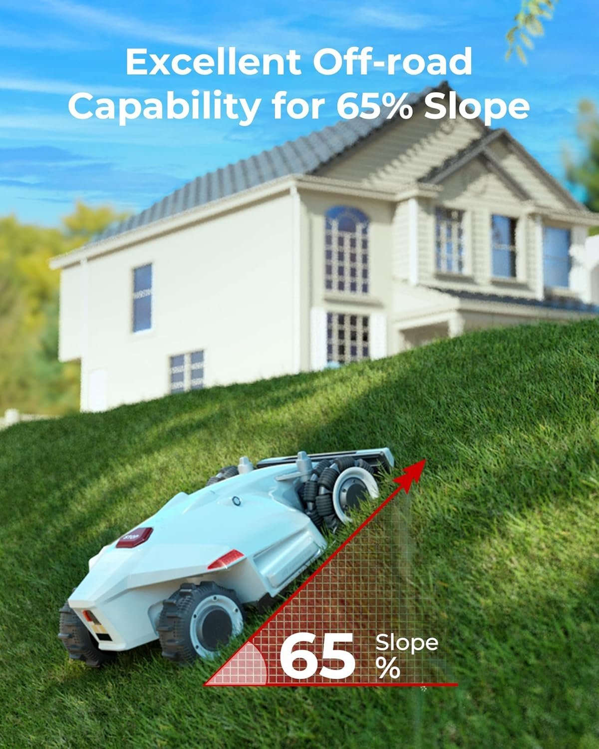 - ALL-WHEEL DRIVE FOR 65% SLOPE (33°): Featuring four powerful in-hub motors and exclusive off-road tires and suspensions, LUBA AWD 1000 automatic robot lawn mower boasts outstanding traction and zero-turning agility on complex lawn. Unlike small-diameter wheel mowers, the LUBA AWD 1000 robot mower can effortlessly handle 65% slope (33°) and traverse the most demanding terrain without getting stuck.