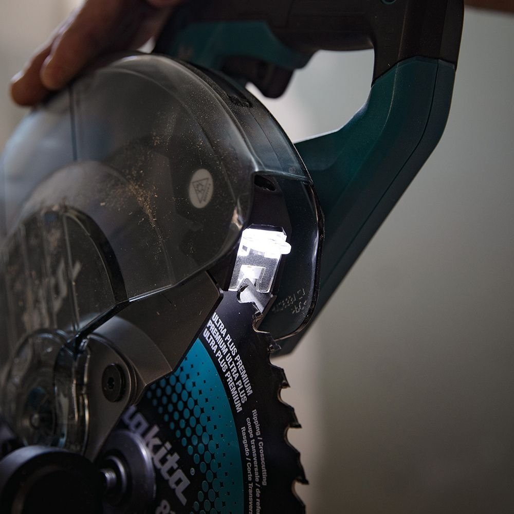 L.E.D light casts a shadow of the saw blade onto the material as an exact cutting line