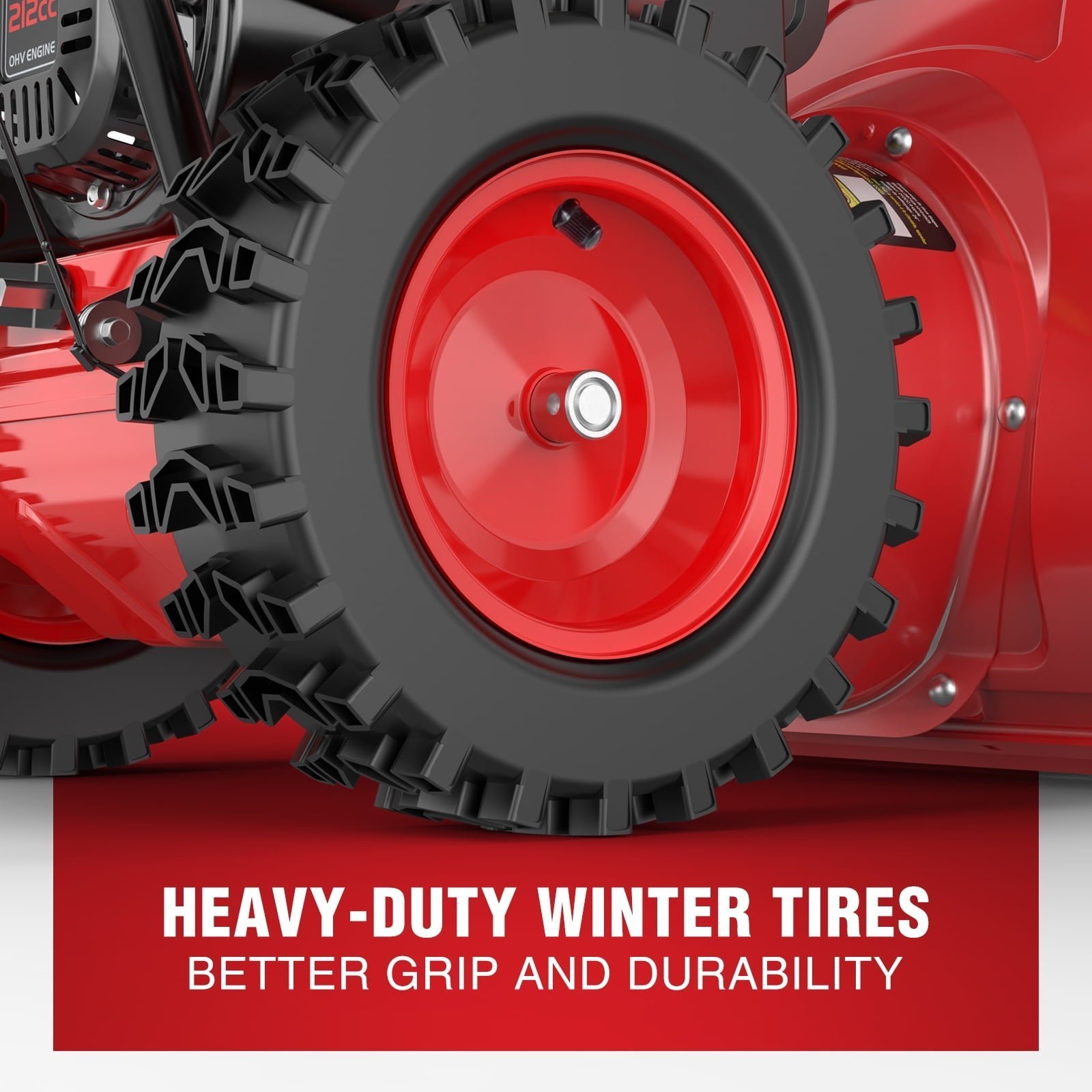 Powered by a robust 212cc engine, this 2-stage snow blower ensures efficient snow removal with three start options: 120V electric, pull-start, or extension cord electric ignition. Its all-steel auger cuts through heavy snow and prevents clogging while throwing snow up to 45 feet. Equipped with 6 forward and 2 reverse speeds, all-terrain tires, and one-hand 180° chute control, it handles driveways for up to 10 cars and snow depths of 6–12 inches with ease.