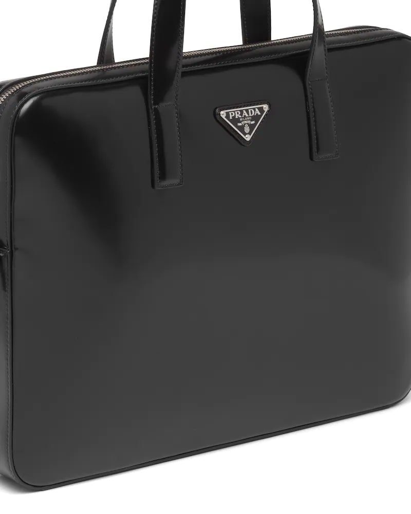 This briefcase with a sleek design is made of brushed leather, an iconic material of the brand since the ’90s and traditionally linked to the luxury world. The triangle logo introduced for the first time on trunks designed by Mario Prada accents the accessory.