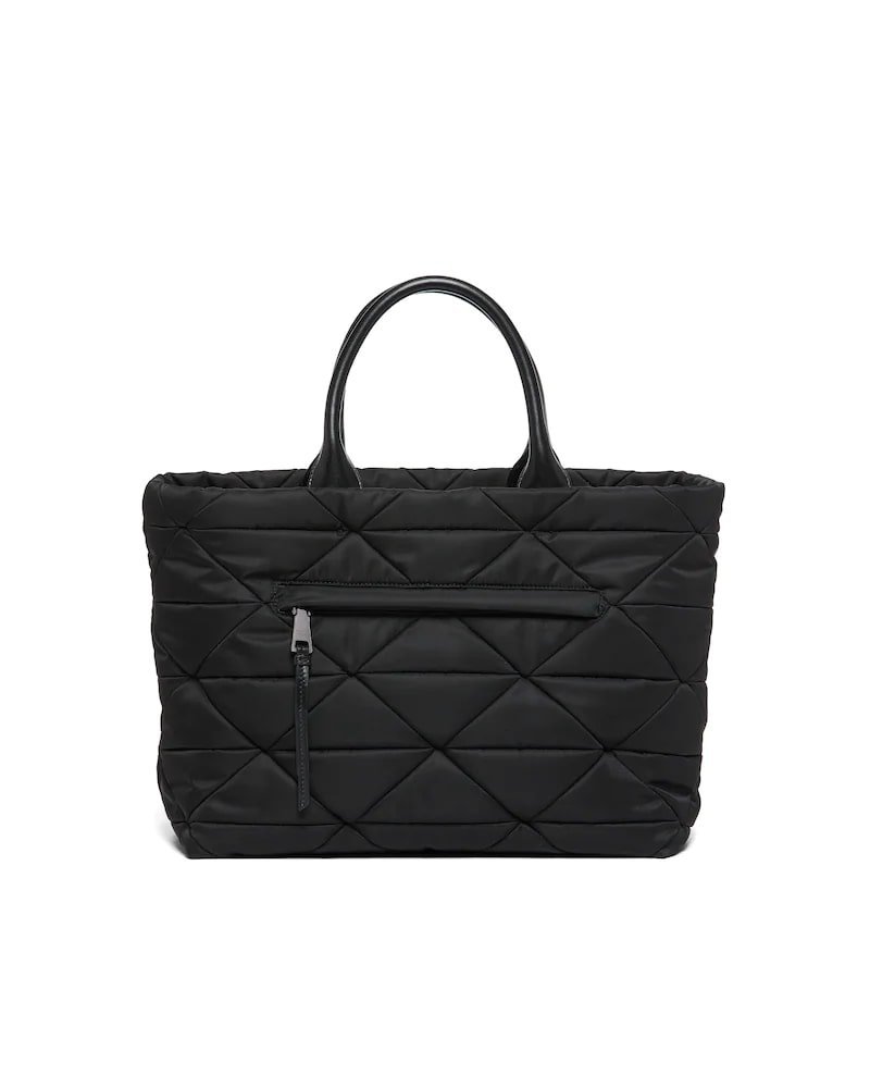 A lively geometric motif characterizes this padded nylon tote. Decorated with nappa leather handles and a detachable woven fabric shoulder strap, it features the iconic enamel triangle on the front.