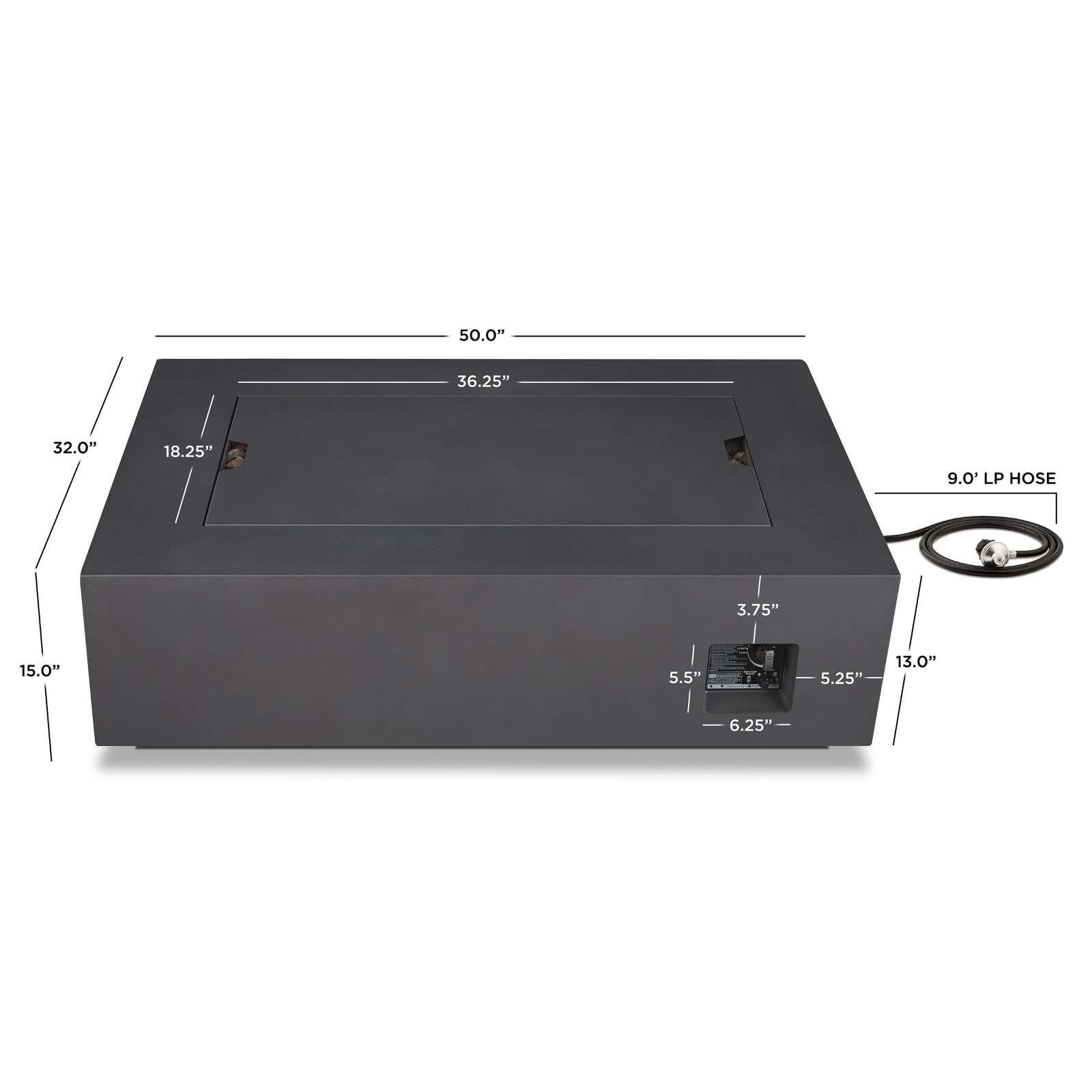 Fire table: 50″L x 32″W x 15″H; 119 lbs