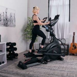 Streamlined console displays time, speed, distance, calories, and heart rate.