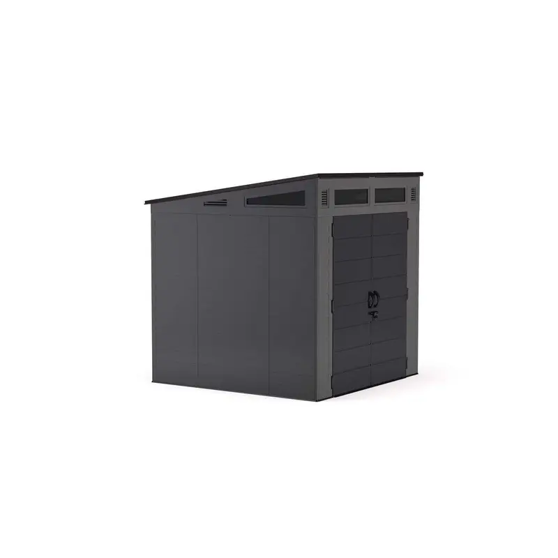 With 317 cu. ft. of storage space, the 7ft x 7ft Modernist Storage Shed by Suncast is ideal for storing all your outdoor equipment, whether a small or large. The reinforced resin floor is built to withstand heavy loads, including tractors, mowers and other lawn or outdoor equipment. Sturdy double doors allow you to access your items easily, and is equipped with pad-lockable metal handles (resin handle, metal slide latch) for added security (lock not included). The metal reinforced, multi-wall resin panel construction provides additional strength and stability to the unit to withstand the elements all year long.