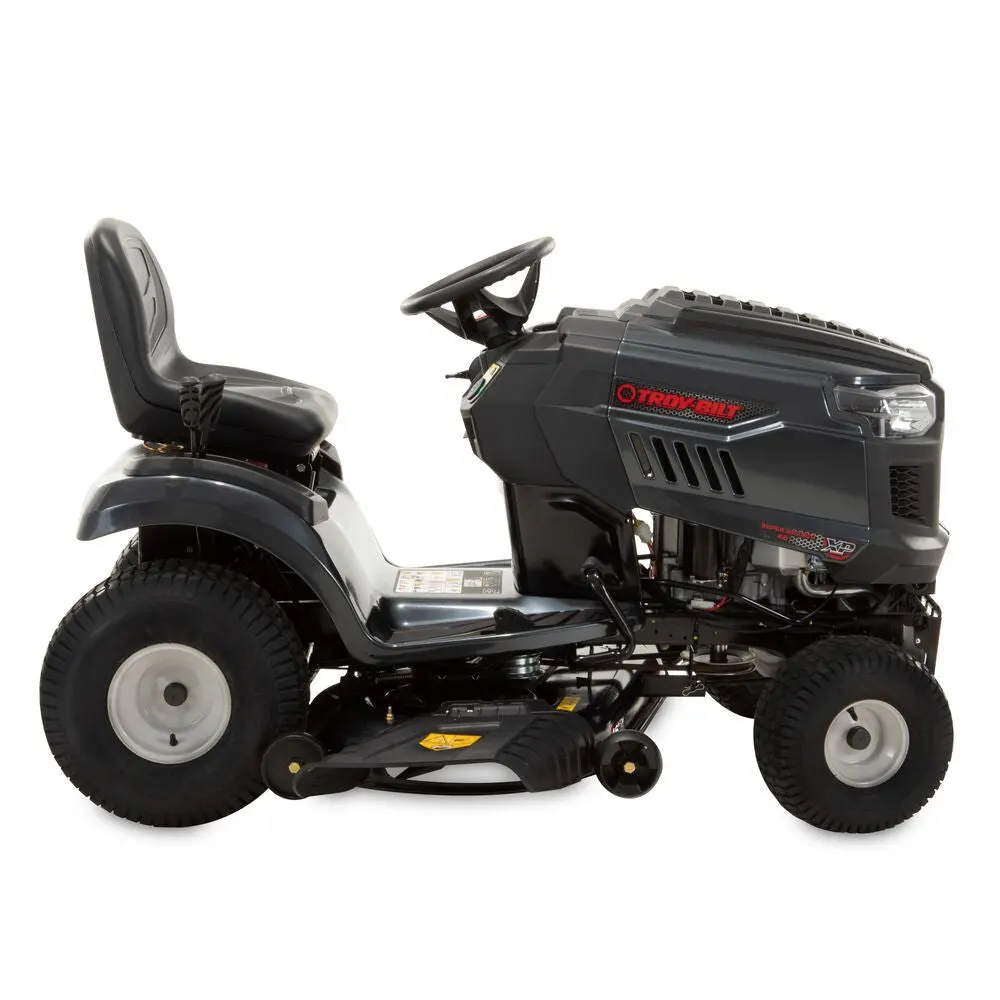 Tackle mowing tasks and other yard work jobs easily with the Troy-Bilt® Super Bronco™ 46K XP riding mower. A large Step-Thru™ frame is designed for easy on-and-off access and includes a rear hitch for quick attachment of tow-behind accessories, like dump carts, spreaders, or aerators (attachments sold separately). Hydrostatic transmission with cruise control is designed for a smooth change of speed and direction, while the adjustable, high-back seat helps provide comfort. The AGM battery is designed to provide reliable starting season after season.