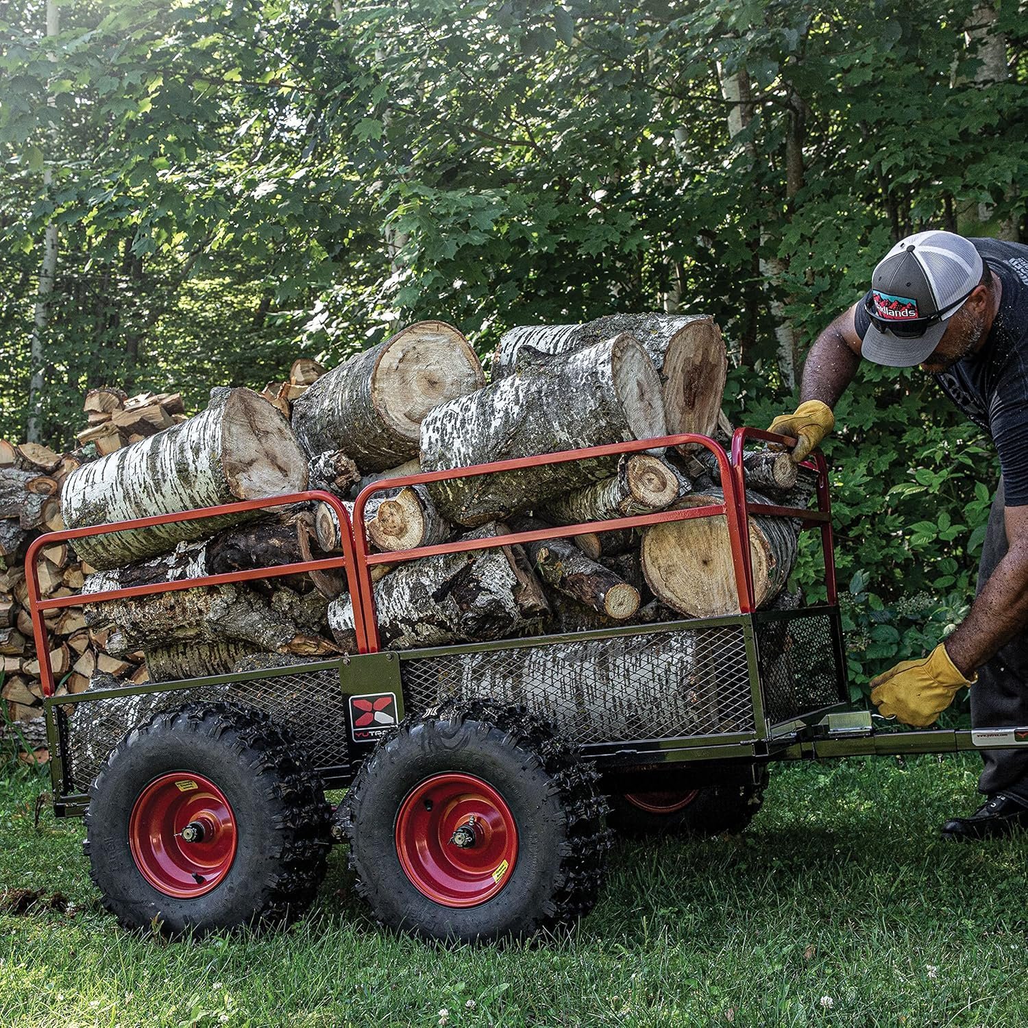 • Pivoting and tilting bed for easier loading and unloading. Pass-through axle eliminates the chance that brush will get caught to keep you moving down the trail smoothly. Large knobby flotation tires help absorb shock and provide additional traction and stability.